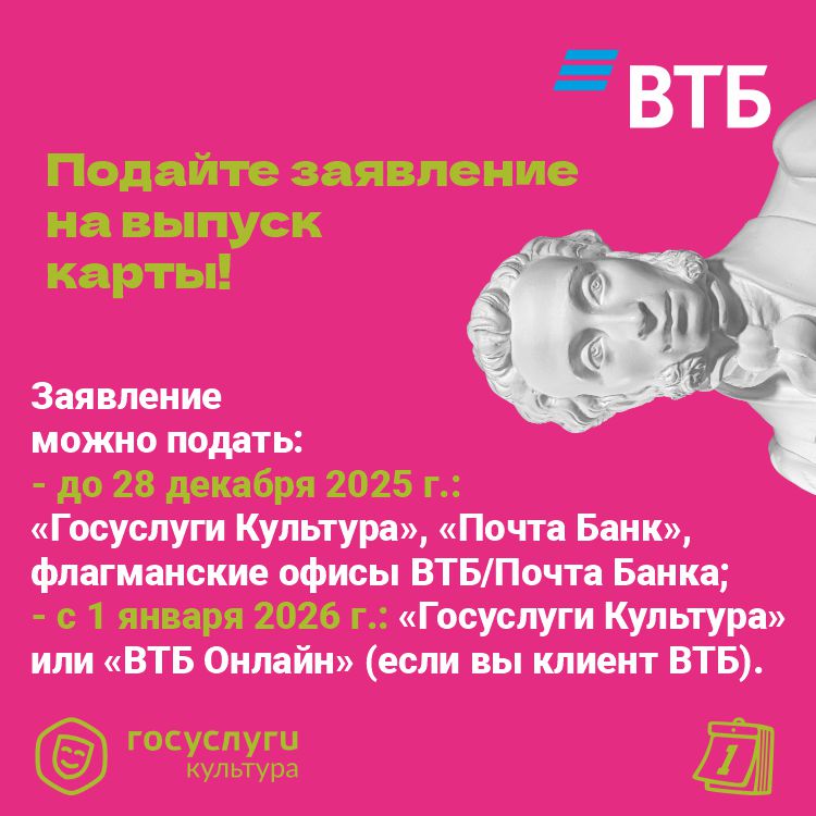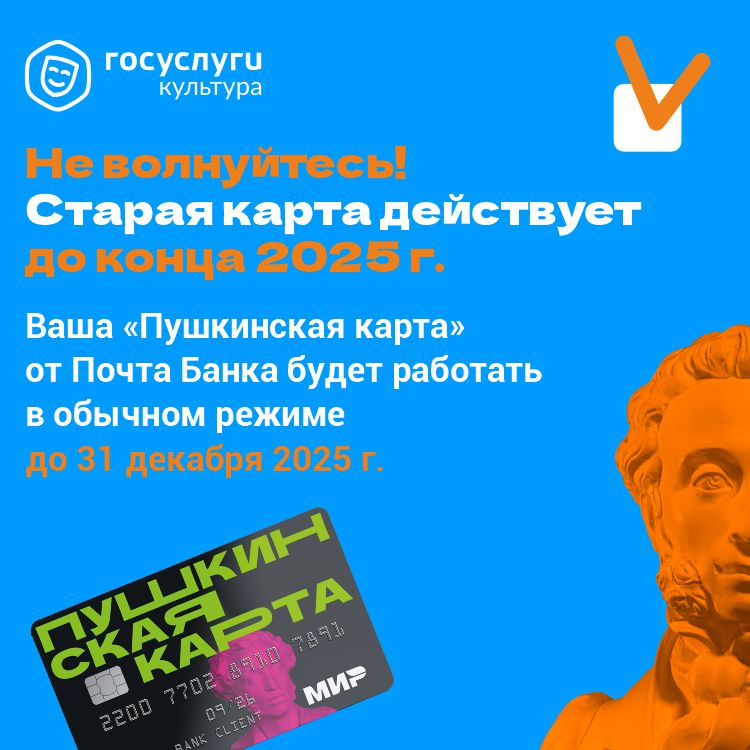 Пушкинская карта![]() ![]() ![]() ![]() Что такое программа «Пушкинская карта»«Пушкинская карта» — это государственная программа, которая позволяет молодым людям в возрасте от 14 до 22 лет включительно тратить бюджетные средства на посещение культурных мероприятий, таких как театры, музеи, выставки, библиотеки и кинотеатры. Участникам программы ежегодно начисляется определенная сумма на специальную карту платежной системы «Мир». Потратить эти деньги можно только на культурные мероприятия, участвующие в программе. Участники: Граждане России в возрасте от 14 до 22 лет. Как оформить «Пушкинскую карту»?Старт программы произошел 1 сентября 2021 года. Чтобы принять участие в программе, гражданину нужно будет зарегистрироваться на портале «Госуслуги», установить мобильное приложение «Госуслуги.Культура» и получить «Пушкинскую карту» — виртуальную или пластиковую карту платежной системы «Мир». Инфографика по оформлению карты: доступно в AppStore, Google Play, AppGallery и RuStore Внимание! С 1 января Банк ВТБ 2026 года станет новым оператором программы «Пушкинская карта», которая реализуется при поддержке нацпроекта «Семья». Владельцы Пушкинских карт могут подать заявление на перевыпуск карты Банком ВТБ через приложение «Госуслуги. Культура», а также в приложении и офисах «Почта Банка», текущего оператора программы. Карта с обновленным лимитом в 5000 руб. появится 1 января в приложениях «Госуслуги. Культура» и мобильном приложении Банка ВТБ. Пластиковую карту можно будет получить в офисах банка с 12 января. Текущие Пушкинские карты будут действовать до 31.12.2025. Как принять участие в программе?